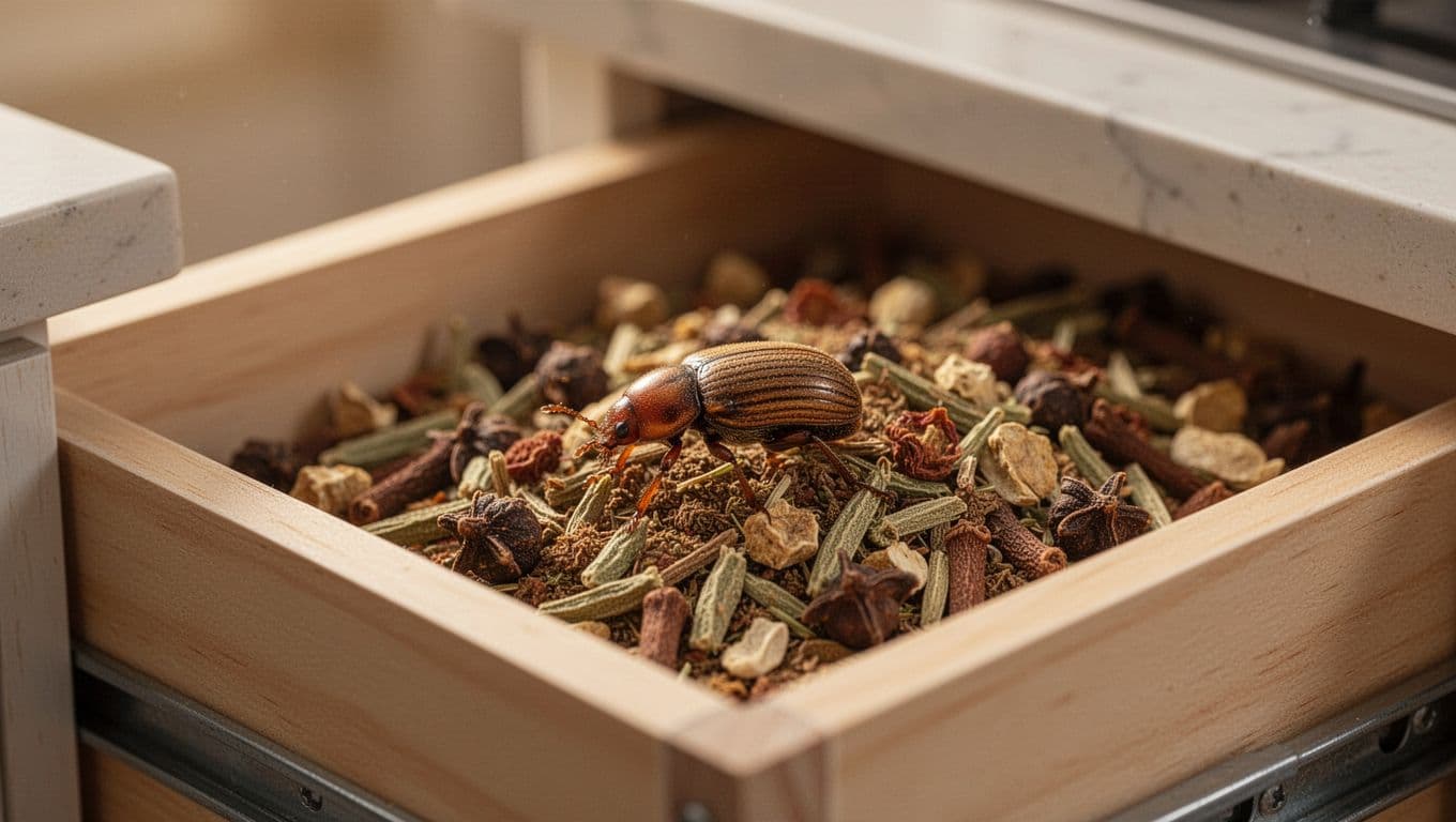 Spice drawers top the trouble spots. Beetles burrow into ground powders. Paprika clumps hide eggs best. Whole spices crack open for larvae.