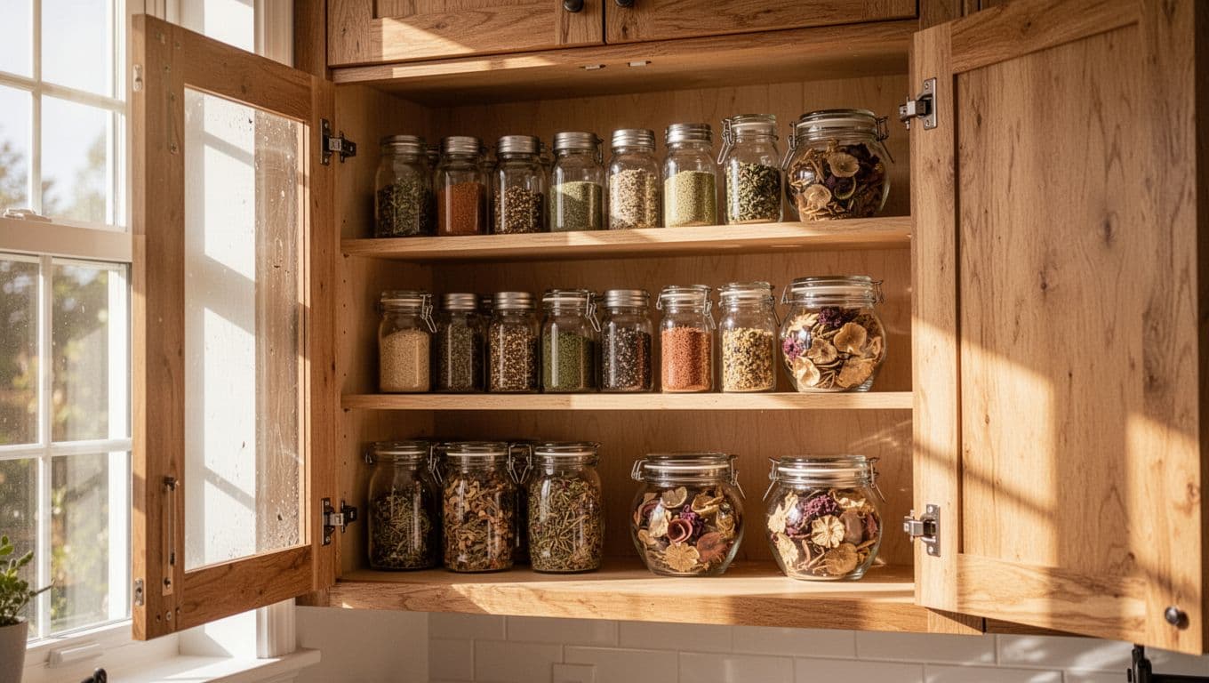 Kitchen cabinets hold extras. Back corners stay dark and dry. Unused herb jars sit forgotten.