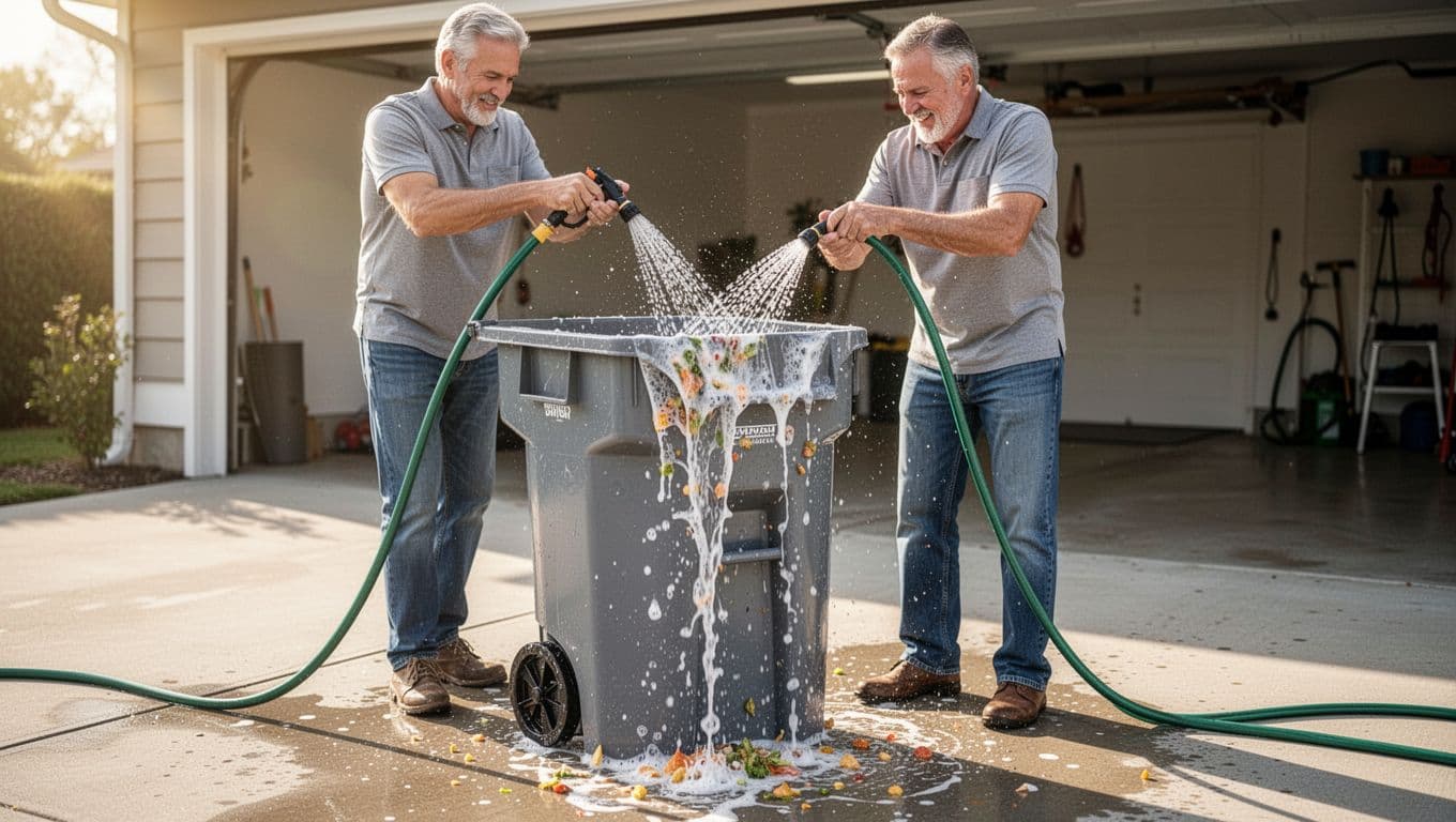 For garage cans, pull them into shade first. Use a stiff brush on seams. Sprinkle baking soda inside after drying. It soaks up moisture and odors.