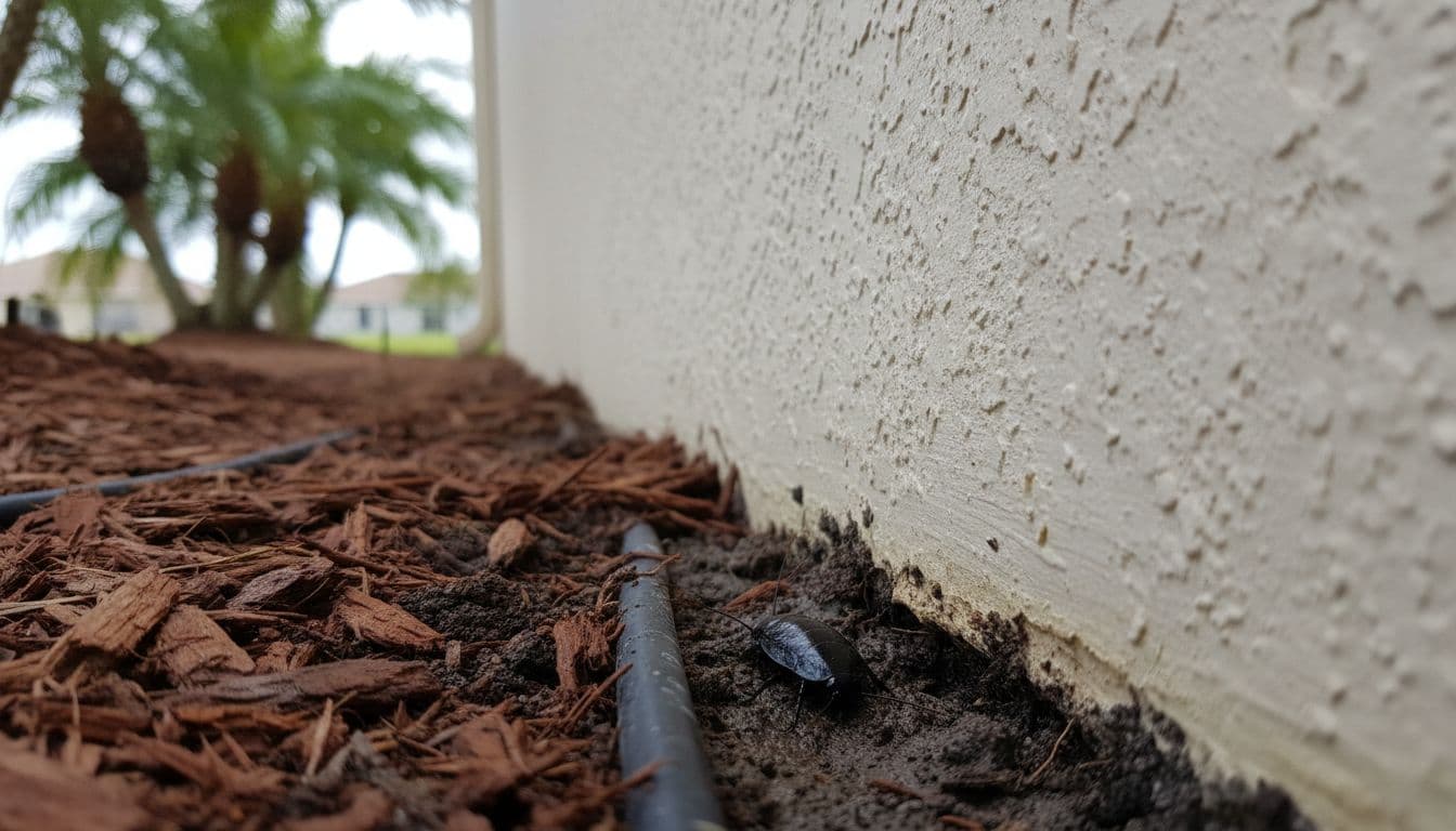 Mulch piled too close to the wall can make things worse. It keeps the edge of the home cooler and wetter, and it hides the exact gap the roaches are using. The same is true around meter boxes and irrigation lines that run toward the structure.