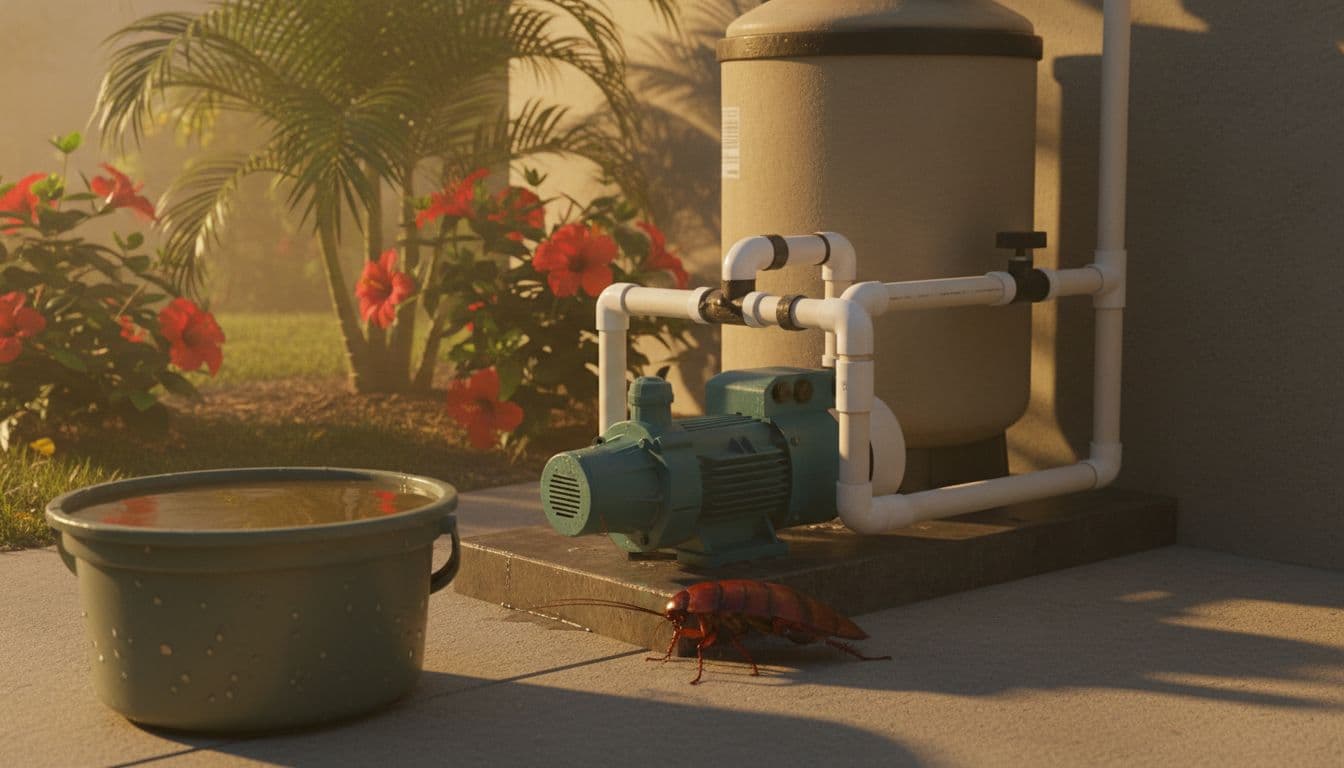 Pool areas have their own pull. Pump pads, filter equipment, hose bibs, deck drains, and buckets often stay damp. Add thick landscaping, mulch, and warm evening air, and you get a near-perfect resting zone. Standing water nearby doesn't feed roaches the way it feeds mosquitoes, but it does raise moisture levels around the places they hide.