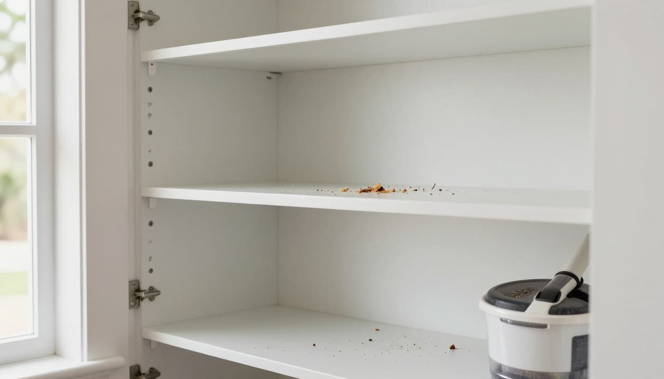 Next, vacuum shelves. Use the crevice tool on cracks and edges. Empty the bag outside right away. Wipe with soapy water after. Dry fully before restocking.